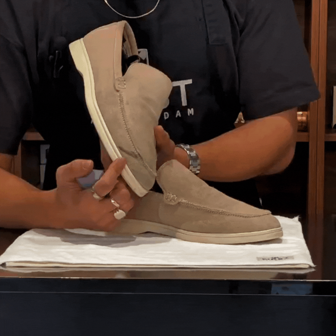 Füllen Sie einen Behälter mit lauwarmem Wasser und tauchen Sie die Bürste hinein. Geben Sie dann das Produkt in den Pinsel und tauchen Sie ihn erneut in das Wasser. Schütteln Sie das Wasser ab und bürsten Sie den Schuh, bis das Produkt gut zu schäumen beginnt. Trocknen Sie den Schuh anschließend mit dem Mikrofasertuch ab und schon sind Ihre Schuhe wieder wie neu!