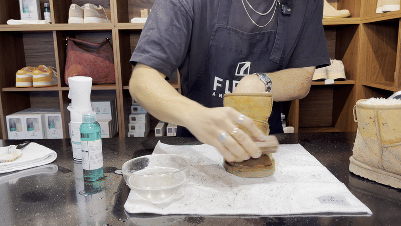 Füllen Sie einen Behälter mit lauwarmem Wasser und tauchen Sie die Bürste hinein. Geben Sie dann das Produkt in den Pinsel und tauchen Sie ihn erneut in das Wasser. Schütteln Sie das Wasser ab und bürsten Sie den Schuh, bis das Produkt gut zu schäumen beginnt. Trocknen Sie den Schuh anschließend mit dem Mikrofasertuch ab und schon sind Ihre Schuhe wieder wie neu!