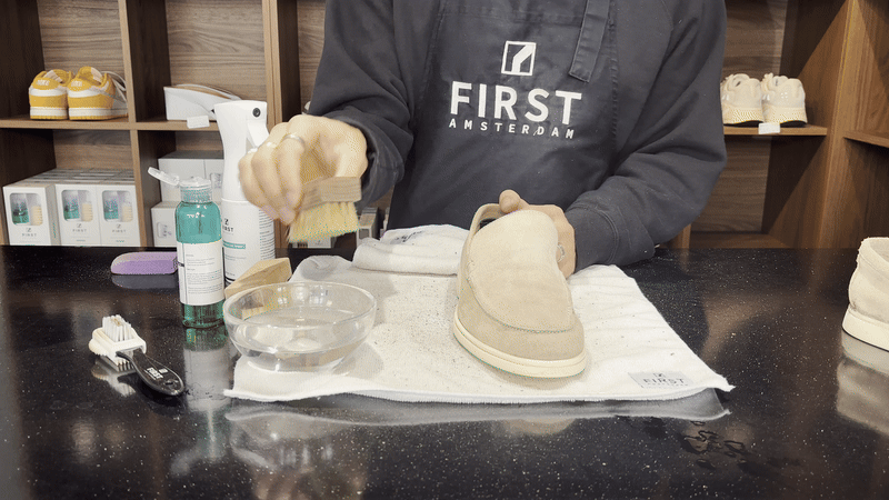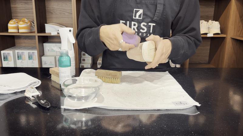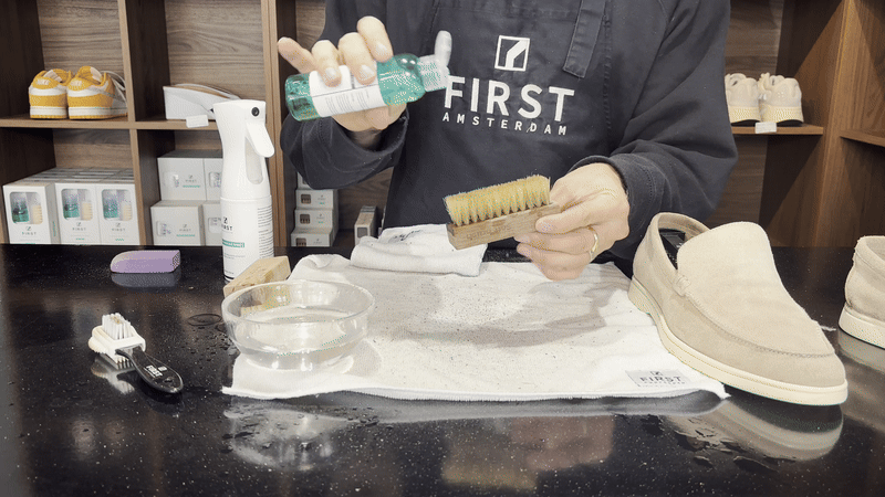 Fill a container with lukewarm water and dip the brush in it. Then add the product to the brush and dip it in the water again. Shake off the water and brush the shoe until the product starts to foam well. Then dry the shoe with the microfiber cloth and your shoes will be like new again!