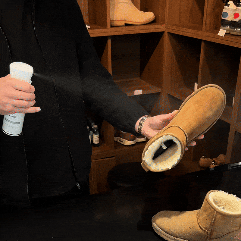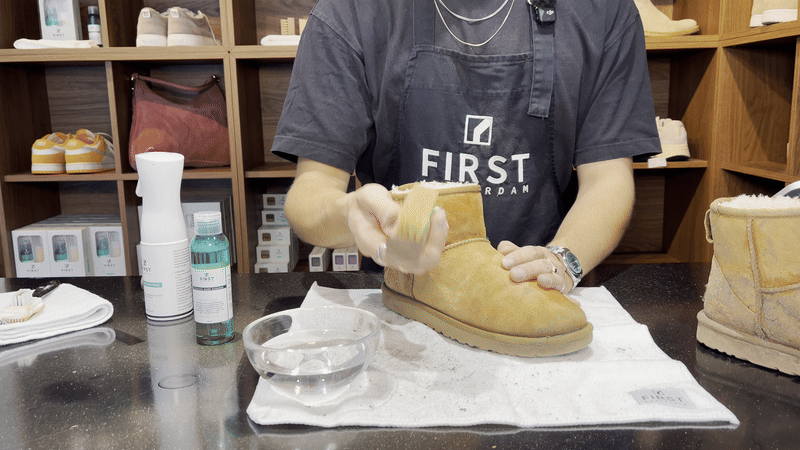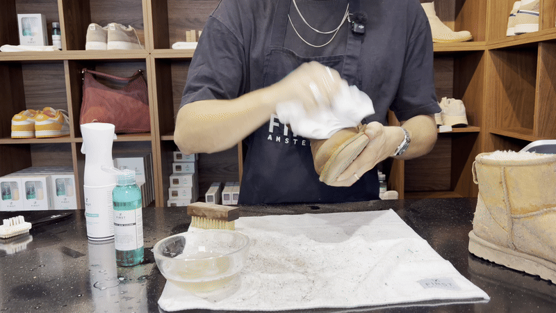 Fill a container with lukewarm water and dip the brush in it. Then add the product to the brush and dip it in the water again. Shake off the water and brush the shoe until the product starts to foam well. Then dry the shoe with the microfiber cloth and your shoes will be like new again!